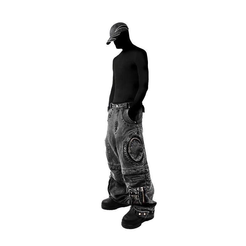 American High Street Jeans for Men and Women Retro Street Style Distressed Washed Zipper Large Pocket Loose Straight Workwear Pants