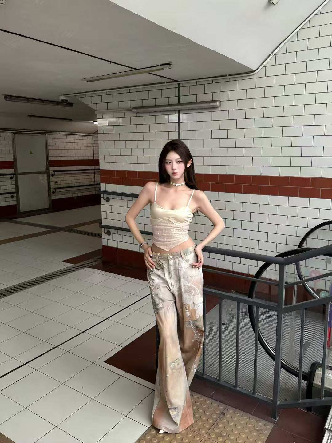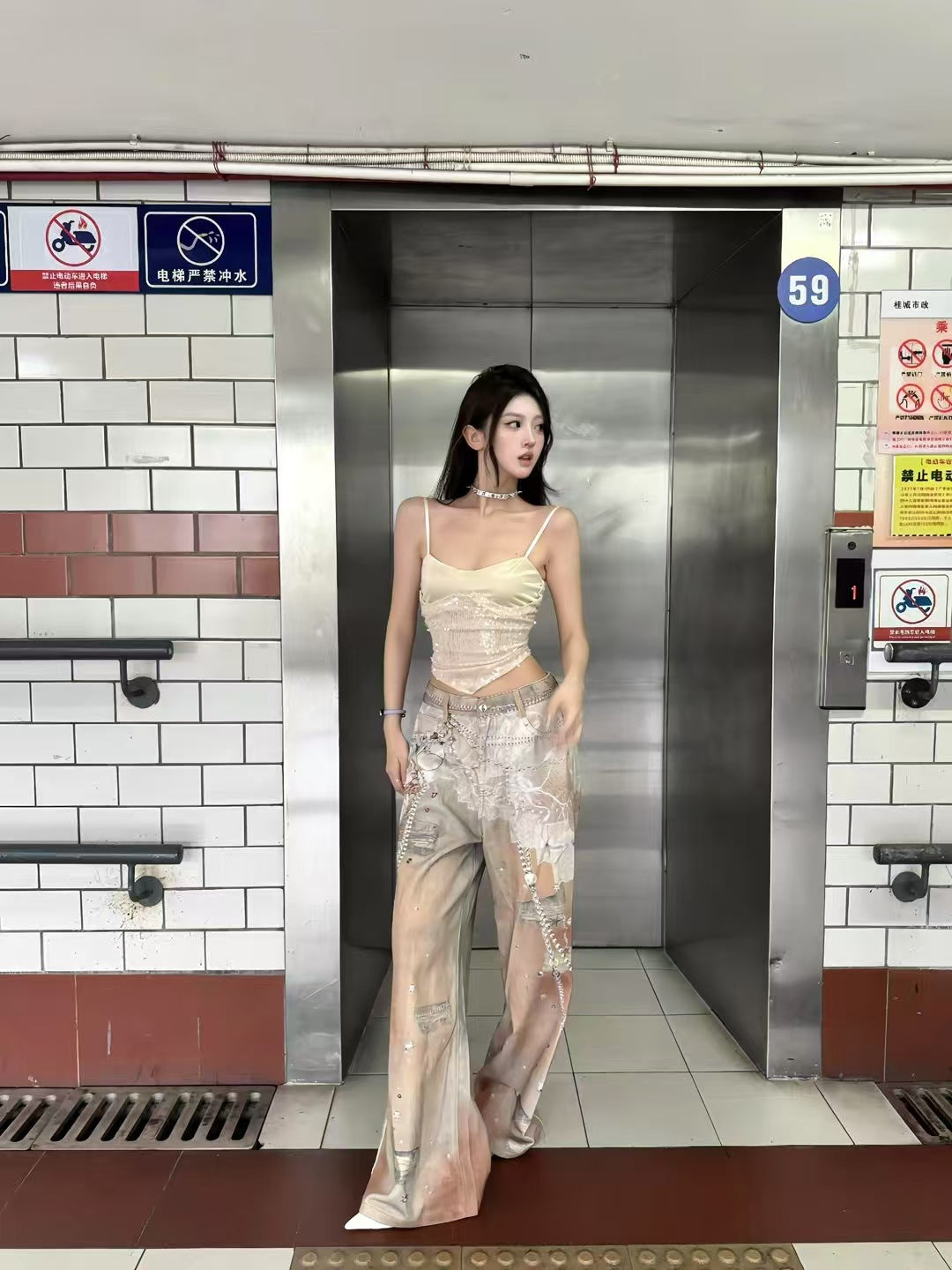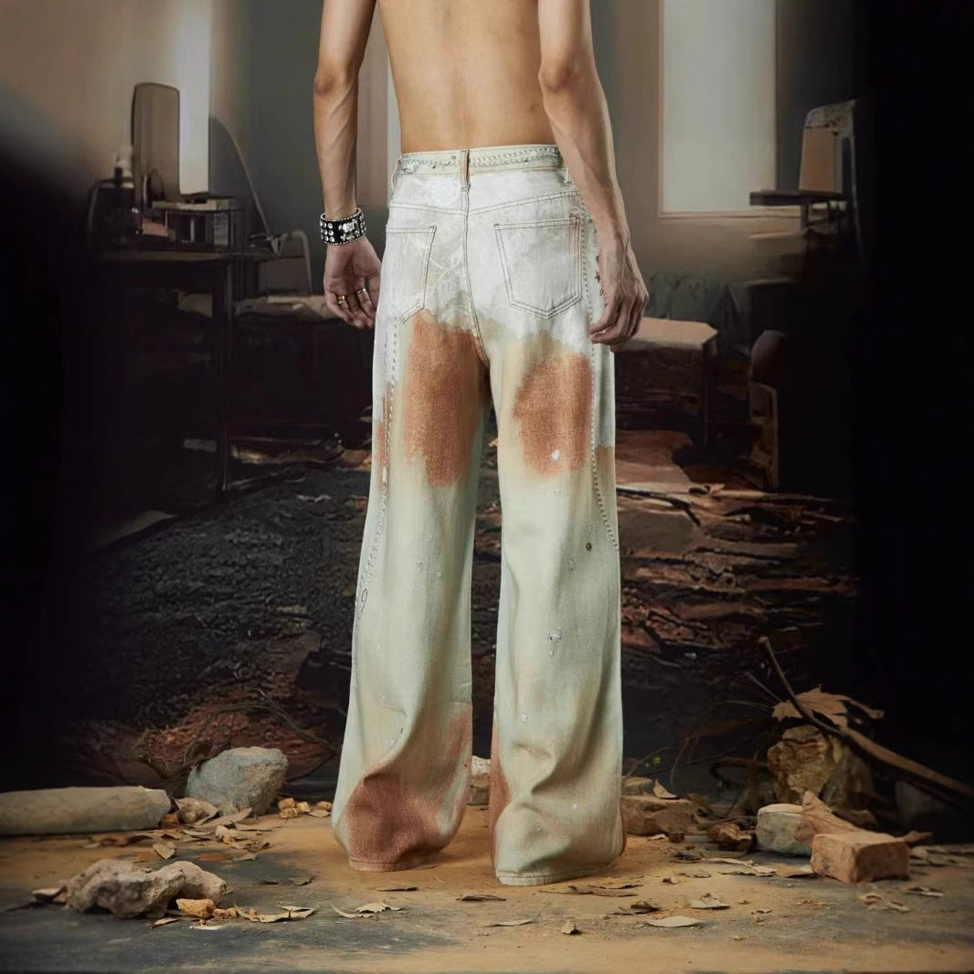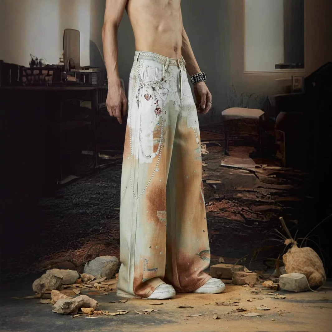 Cross-Border Heavy Industry Chain Print Jeans for Men and Women Summer American Style Straight-Leg Floor-Length Pants