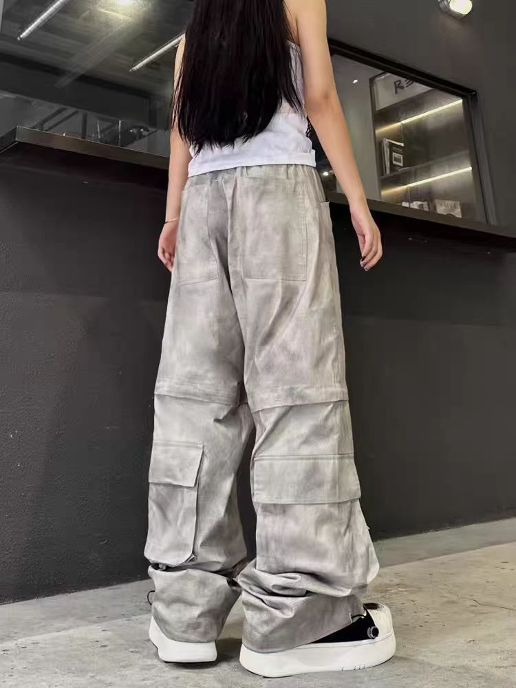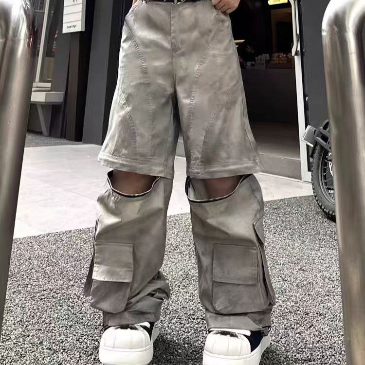 European and American Style Long Design Sense Wasteland Vintage Dirty Dyed Cargo Pants for Men and Women with Detachable Multi-Pocket Zipper Hip-Hop Street Dance