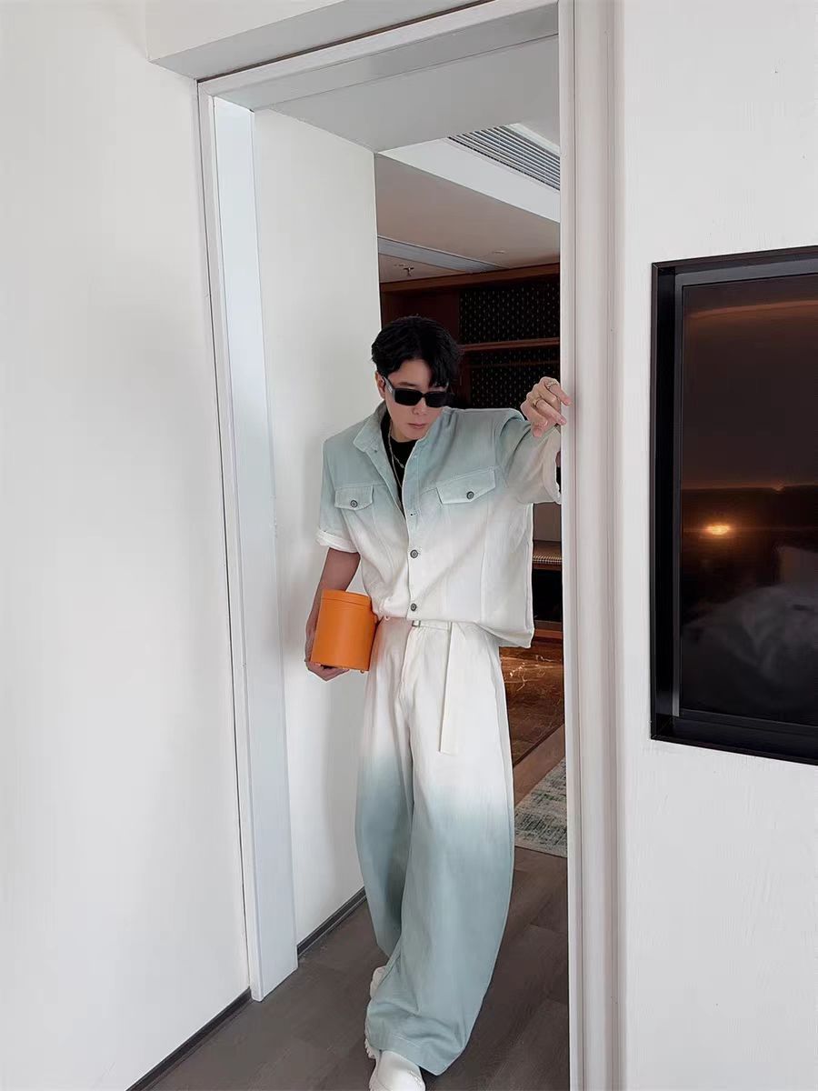 Gradient Short Sleeve Denim Suit for Men2025Summer Loose Casual Scimitar Wide-Leg Pants Jacket Set