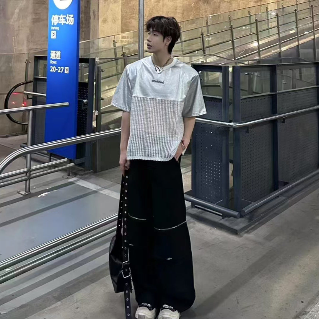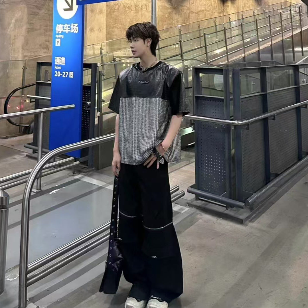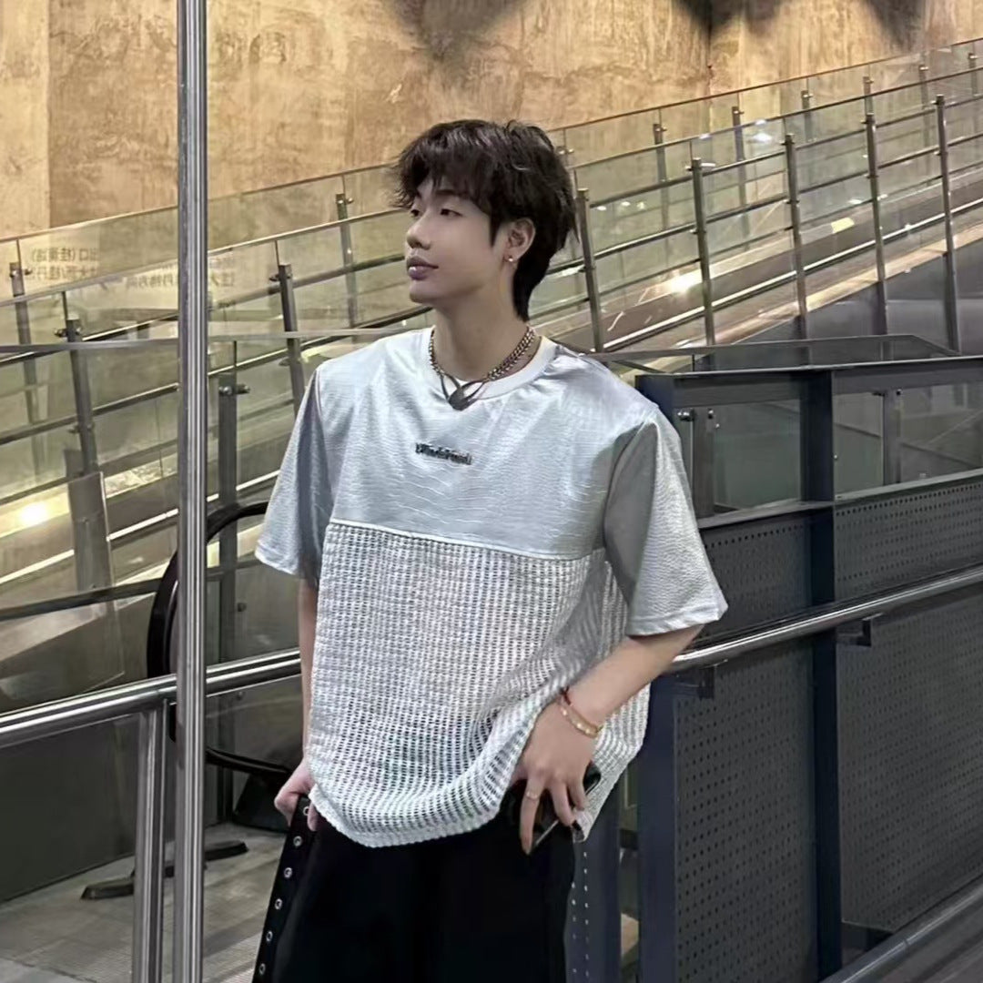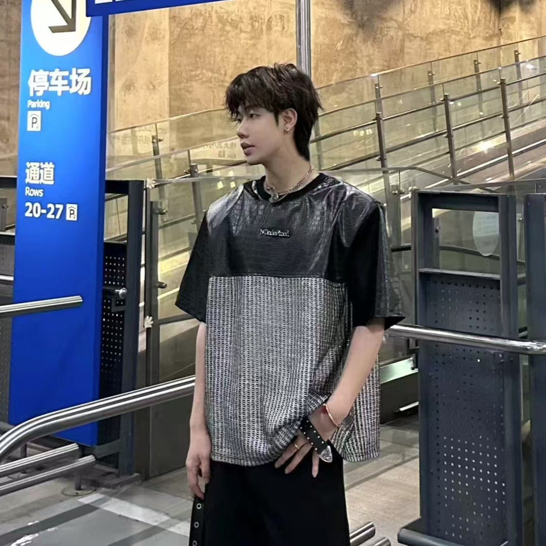 Unique Design Crocodile Pattern Leather Mesh Patchwork Short Sleeve High-end Metal Wide Shoulder Pads T Shirt