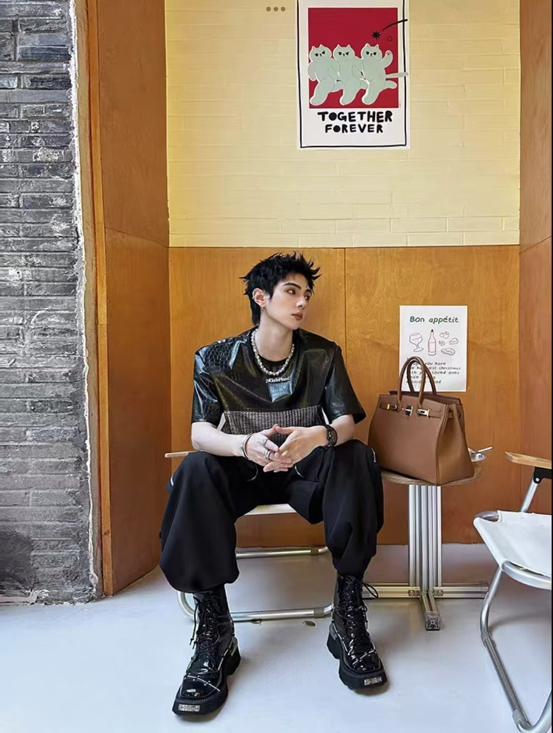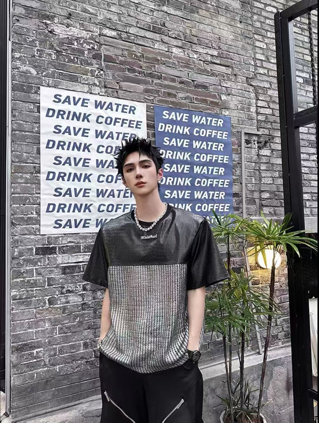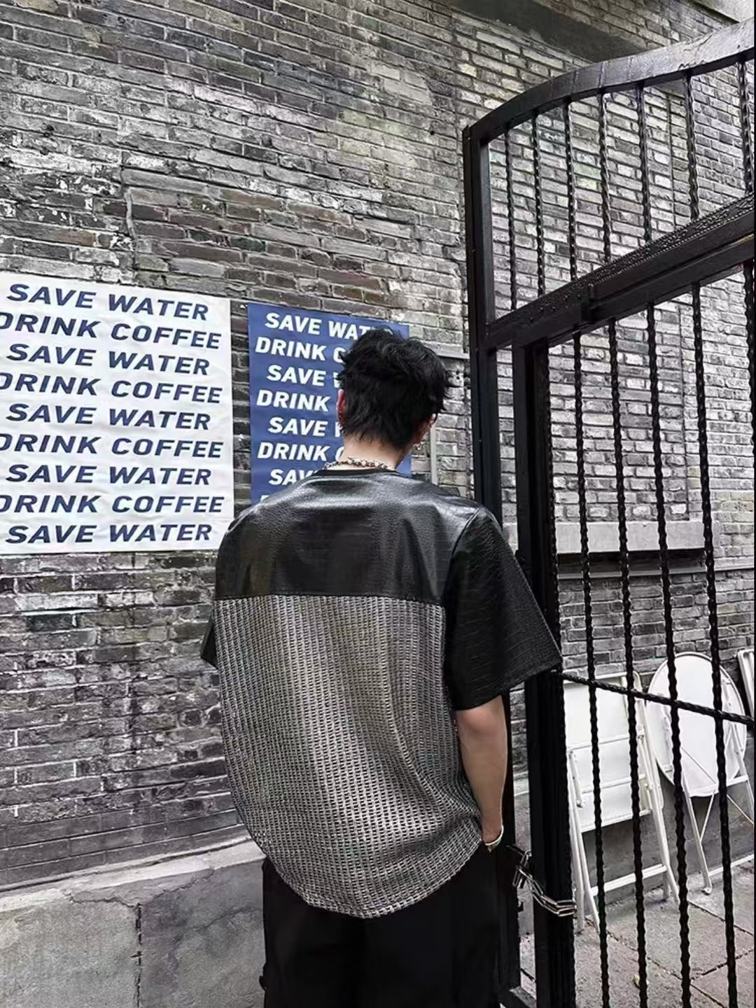 Unique Design Crocodile Pattern Leather Mesh Patchwork Short Sleeve High-end Metal Wide Shoulder Pads T Shirt